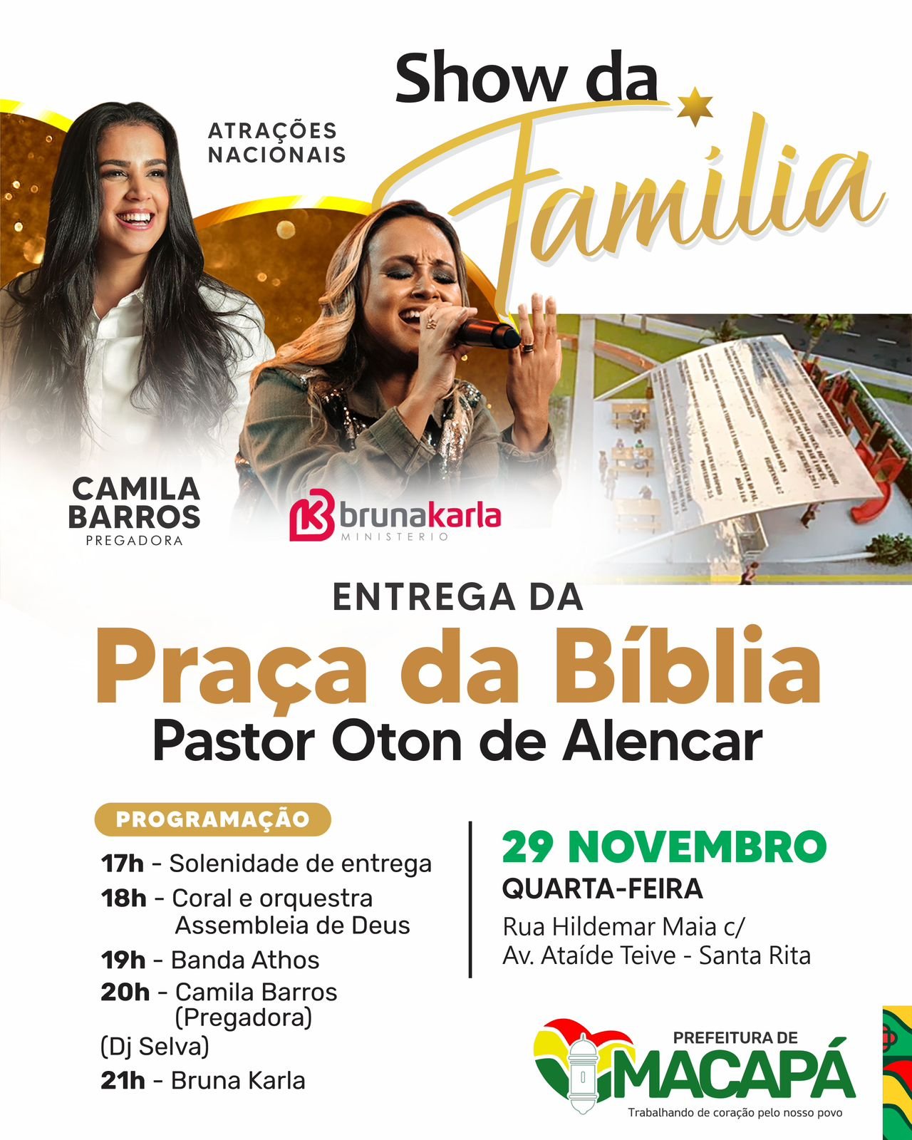 Após cerimônia de inauguração, haverá programações musicais aos presentes, com destaque para duas atrações nacionais: pregação da pastora Camila Barros e show da cantora gospel Bruna Karla e Ministério