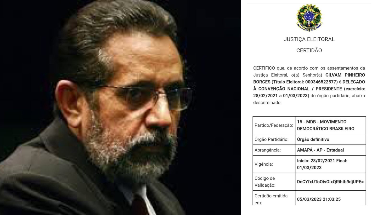 A certidão eleitoral emitida no último dia 05/03 confirma o fim do mandato de gilvam como presidente em 01/03.
