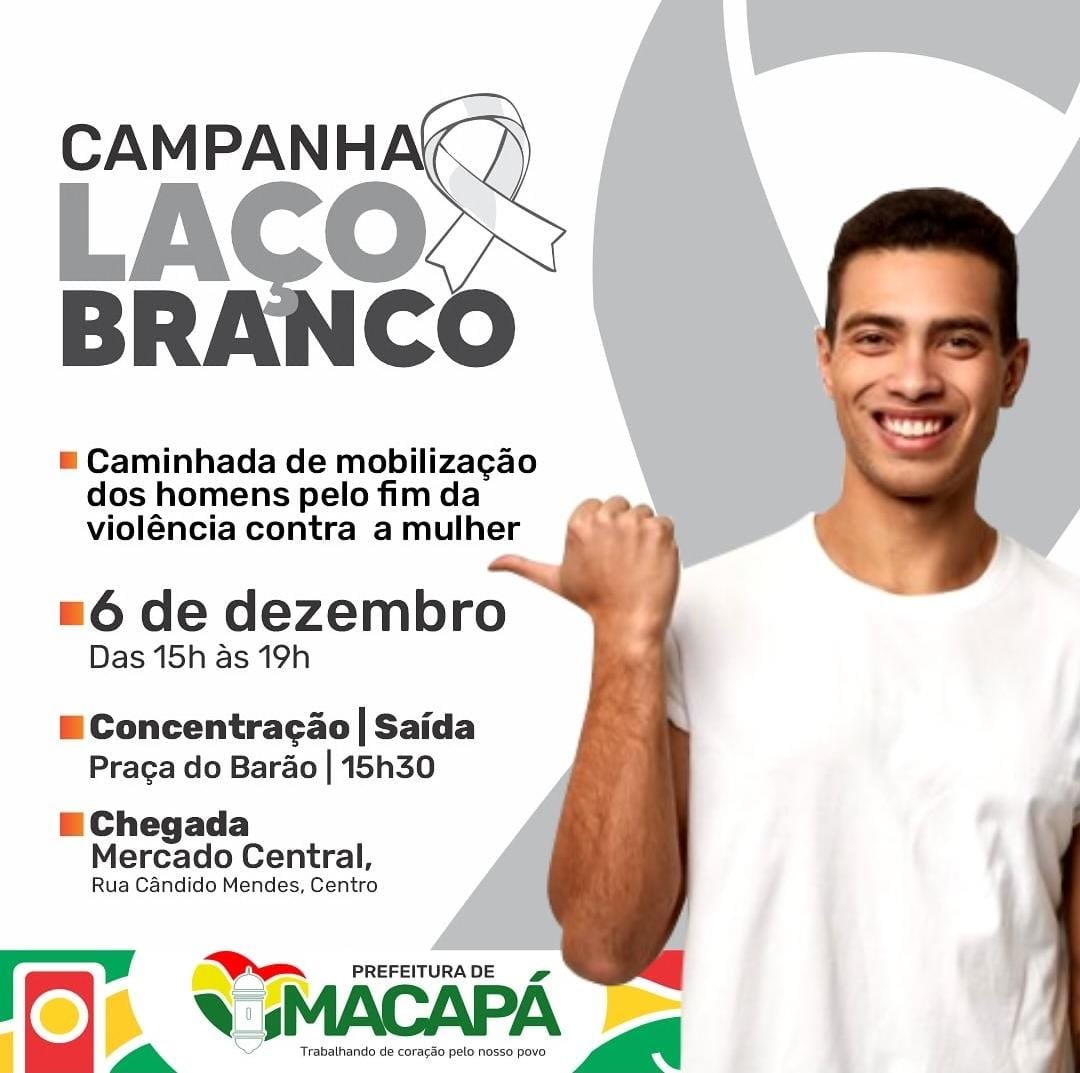 A Prefeitura de Macapá, através da Secretaria Municipal Direitos Humanos (SMDH), promove nesta quarta-feira (6) a caminhada do Laço Branco. Uma campanha cujo objetivo é chamar a atenção dos homens para o fim da violência contra a mulher. Ponto de partida da caminhada será às 15h30, na Praça do Barão, com destino ao Mercado Central.